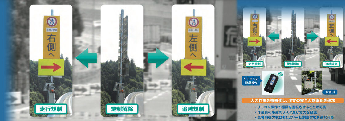 従来は、作業者が手動で標識を反転させていましたが、走行車両の追突など、事故の危険が伴いました。