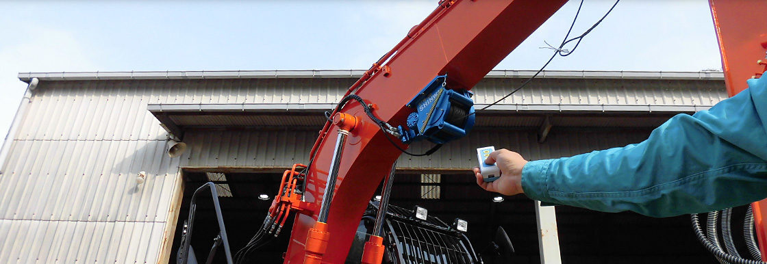 林業用小型パワーウィンチは、木材の運搬を目的にしたバックホー/ユンボ/油圧ショベルなどの重機用アタッチメント製品です。運搬する木材を固定する際に行うウインチドラムのアンロック、ロックに加え、ワイヤーロープの巻き戻しなどのインチング操作を、2.4GHz帯の無線リモコンで遠隔制御することが可能です。長崎進和工機様のグラップル、スイングヤーダーとの組み合わせで、効率的で安全な作業を可能とします。