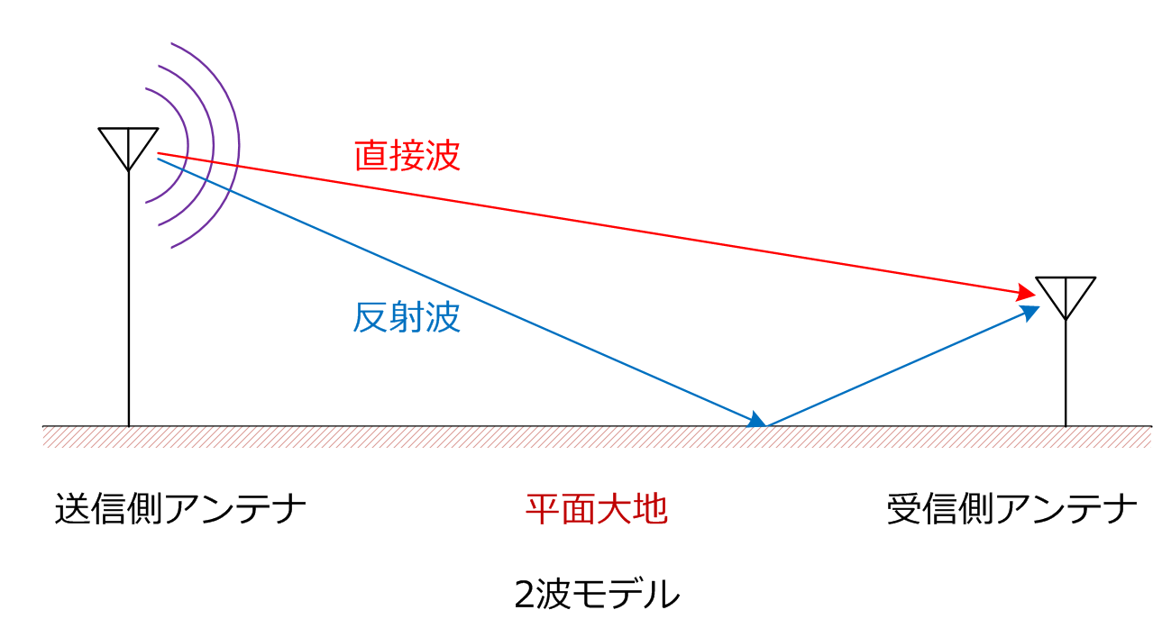 全反射する平面大地がある空間。受信点では直接波と大地反射波の2波が到来し互いに干渉します。直接波と大地反射波が逆位相となる点では互いに打ち消し合い受信電力は小さく(デッドポイント)なります。受信電力が落ち込むポイントは数メートルの近傍で多く発生します。